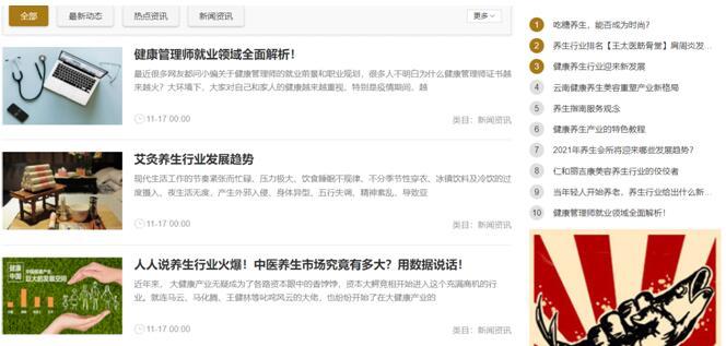 在健康资讯版块中,我们可以看到不仅囊括了养生知识,还有着行业发展、行业需求等更多内容,既为养生者服务,也为想要从事养生行业的人提供信息,促进行业的整体发展与提升。